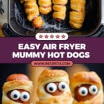 These Air Fryer Mummy Hot Dogs are a fun and spooky Halloween snack that’s easy to make with just three ingredients. Wrapped in crescent dough strips to resemble mummies and topped with candy eyes, they come together quickly in the air fryer for a golden, delicious treat perfect for parties or festive gatherings.