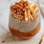 - Assemble: Divide the prepared chia pudding evenly among 3 jars. Layer the stewed apples over the pudding, then sprinkle with the oat and nut crumble (about 2 tbsp per jar or as desired). Serve with optional extra apple butter and maple syrup for added flavor.