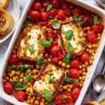 Baked Feta Chickpeas is a vibrant and flavorful dish featuring roasted cherry tomatoes, chickpeas, and garlic combined with creamy, bubbling feta cheese. This easy-to-make, comforting recipe is perfect for a quick weeknight dinner served with toasted bread and fresh basil for a touch of herbaceous brightness.