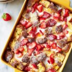 - Serve: Serve the baked French toast warm, topped with the remaining fresh strawberries and a dusting of confectioners’ sugar, if desired.