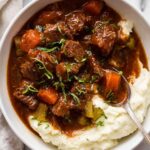 A rich and hearty Beef and Guinness Stew featuring tender chunks of slow-cooked beef simmered in a robust Guinness beer sauce with aromatic vegetables and herbs, perfect for a comforting meal served alongside creamy mashed potatoes.