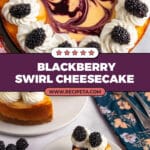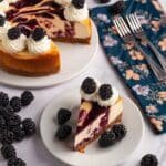 - Decorate and Serve: Pipe or spread the whipped cream around the edges of the cheesecake and garnish with fresh blackberries. Slice and enjoy your beautifully swirled blackberry cheesecake!