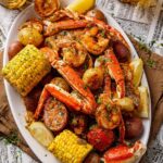 A flavorful Cajun seafood boil featuring tender baby potatoes, smoky andouille sausage, fresh corn on the cob, succulent snow crab clusters, and jumbo shrimp, all cooked together in a spicy, aromatic broth. Served with a rich garlic butter sauce infused with Cajun spices and fresh lemon juice, this dish delivers a fun, interactive dining experience perfect for gatherings.