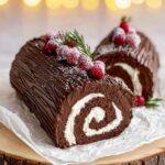 This classic Yule Log Cake (Bûche de Noël) features a light and fluffy chocolate sponge cake rolled with a luscious whipped cream filling and covered with a rich chocolate ganache. Perfect for holiday celebrations, the cake is decorated to resemble a festive log, combining elegant presentation with delicious flavors.