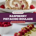 - Decorate the Cake: Cover the rolled cake with the remaining white chocolate cream using the back of a tablespoon or spatula. Sprinkle chopped pistachios on top and decorate with the reserved fresh raspberries.