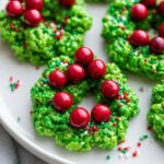 Delight in the festive fun of Christmas Wreath Cookies, a no-bake treat made with buttery marshmallows, crunchy cornflakes, and colorful red candies that mimic holly berries. These cheerful wreath-shaped cookies are easy to whip up in minutes, perfect for holiday parties and gifting.