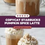 This Copycat Starbucks Pumpkin Spice Latte recipe lets you enjoy the rich, cozy flavors of the beloved fall drink in the comfort of your own kitchen. Made with real pumpkin purée, pumpkin pie spice, espresso, and creamy whole milk topped with whipped cream, this latte is a perfect blend of spice and sweetness to warm you up on chilly days.