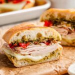 Enjoy a delicious and easy-to-make Copycat Starbucks Turkey Pesto Sandwich featuring ciabatta rolls, basil pesto, roasted red peppers, deli turkey, and provolone cheese. Grilled to perfection in a panini press, this sandwich offers a warm, melty experience perfect for a quick lunch or dinner.