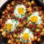 This Corned Beef Hash and Eggs recipe is a hearty and flavorful breakfast dish featuring perfectly sautéed potatoes, tender corned beef, and vibrant carrots, all seasoned with garlic powder and paprika. Finished with baked eggs in the skillet for a satisfying meal, garnished with fresh parsley.