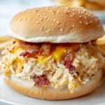 A deliciously creamy and flavorful crockpot chicken recipe made with ranch dressing, cream cheese, cheddar, and bacon, perfect for an easy and satisfying meal served on buns or wraps.
