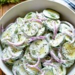 A refreshing and creamy cucumber salad featuring thinly sliced cucumbers and red onions tossed in a tangy sour cream and dill dressing. Perfect as a cool side dish for warm weather meals or picnics.