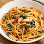 Creamy Tuscan Chicken Pasta combines tender, seasoned chicken breast with a rich and flavorful sauce of sun dried tomatoes, garlic, and fresh basil, tossed with linguine and baby spinach. This one-pan dish delivers a hearty, restaurant-quality meal that’s quick to prepare and perfect for a comforting dinner.