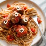 Place each browned meatball onto a serving dish, top them with your spooky zombie eyes, and pile on that saucy gluten-free spaghetti. I promise, it’s as delicious as it is fun to look at. Enjoy the reaction from your guests when they realize they’re about to eat a horde of zombie eyes!
