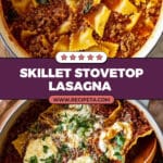 Easy Skillet Stovetop Lasagna is a delicious and convenient twist on classic lasagna, made in one pan directly on the stovetop. Ground beef and Italian sausage are cooked with onions, garlic, and Italian seasoning, then simmered with marinara sauce and broken lasagna noodles. A creamy ricotta and cheese mixture is dolloped on top before finishing with melted mozzarella, Parmesan, and fresh basil for a comforting meal perfect for weeknight dinners without the mess of baking.