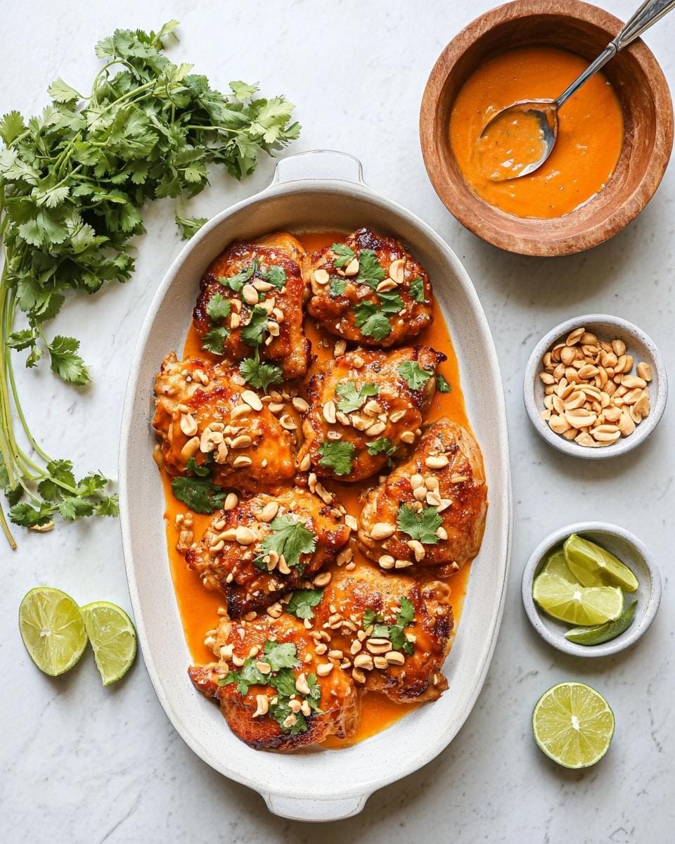 Serve the chicken with the remaining satay sauce on the side for dipping, plus some fresh cilantro, lime slices, and chopped peanuts if you’re feeling fancy. It’s a simple finishing touch that makes a big impact.