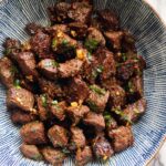 - Remove steak: Transfer the cooked steak bites to a plate and set aside.