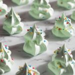 - Pipe the Meringue Trees: Transfer the meringue into a piping bag fitted with a large star tip. Pipe three dollops on top of each other, starting with the largest at the bottom and getting smaller towards the top to create a tree shape. Decorate each meringue with sprinkles while the meringue is still soft.