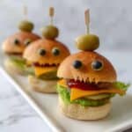 - Attach Olive Eyes: Poke two olives with toothpicks and secure them on top of each burger to serve as ‘eyes,’ completing the Halloween look.