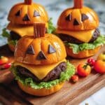 One year I served these burgers on a platter lined with faux spider webs and bat confetti for a fun party centerpiece. Another idea is wrapping the buns in orange and black paper or serving the burgers on mini pumpkin plates to really get into the Halloween spirit. Little edible eyes made of olives or sliced veggies scattered around add extra spookiness.