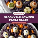 This spooky Halloween Pasta Salad recipe features creatively crafted mushroom skulls, mozzarella eyeballs filled with pesto, and colorful bell pepper shapes tossed with pasta and Italian dressing for a festive and delicious party dish perfect for Halloween celebrations.