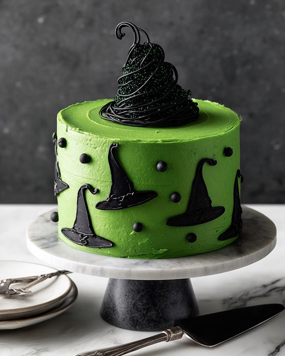 Melt your black candy coating disks and pipe small witch hat shapes onto waxed paper using a piping bag fitted with a tiny round tip. Let them set completely. Then, decorate your cake by piping black frosting with a large star tip onto the top, pressing black pearls and various black sprinkles into the green frosting around the sides, and carefully standing one witch hat on the tip-top of your cake just before serving for maximum effect.