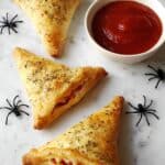 For Halloween parties, I once created a “witch’s cauldron” platter by arranging the calzones in a circle with the “brims” facing out and placing a small bowl of marinara in the middle. I also love placing some candy corn or little plastic spiders around for extra festive flair. Your guests will definitely be asking where you got these adorable calzones!