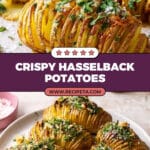 Hasselback Potatoes are a stunning and flavorful side dish where medium Yukon Gold potatoes are thinly sliced but left intact at the bottom, allowing them to fan out during roasting. Coated with olive oil, seasoned with sea salt, black pepper, and fresh sage, then brushed with rich garlic butter and roasted until crisp on the edges and tender inside, these potatoes are finished with fresh parsley and a hint of red pepper flakes for extra flavor.