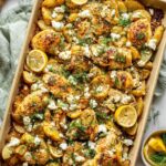 This Sheet Pan Herby Lemon Garlic Chicken and Potatoes recipe features tender boneless chicken thighs and crispy fingerling potatoes roasted together in a zesty lemon-garlic marinade. Enhanced with oregano, paprika, and fresh herbs, this easy-to-make meal is finished with crumbled feta and fresh parsley and dill, delivering a deliciously balanced Mediterranean-inspired dinner with minimal cleanup.