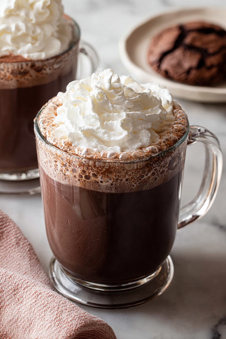 - Serve: Pour the hot chocolate into 4 small mugs and top each serving with homemade whipped cream for an indulgent finish.