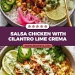 - Assemble & Serve: Serve the shredded salsa chicken topped with the cilantro-lime crema. Enjoy in bowls with your choice of sides, in tortillas, tacos, or any preferred way.