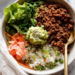 - Assemble Rice Bowls: Spoon a serving of cooked white rice into each bowl. Top with the cooked bulgogi beef, wilted spinach, and julienned carrot. Add a dollop of mashed avocado and a few pieces of pickled ginger. Tuck some baby cos or romaine lettuce down the side. Finish by sprinkling white sesame seeds and sliced green onion over the top. Serve with the drizzle sauce on the side to pour over just before eating.