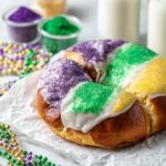 This Mardi Gras King Cake recipe features a soft, braided dough filled with your choice of cinnamon sugar or cream cheese filling, baked to golden perfection and topped with a sweet, colorful frosting. A traditional festive treat, each cake is adorned with purple, green, and gold sugar and includes a hidden plastic baby for added fun. Perfect for sharing during Mardi Gras celebrations or any festive occasion.