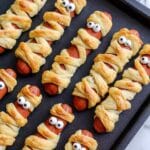 Pop your mummies into the oven and bake for 10 to 12 minutes until the dough puffs up and turns beautifully golden. Your kitchen is going to smell amazing by this point! When they’re out, grab your candy eyes to top off each mummy dog by placing two eyes on each, sticking them on with a small dot of ketchup or mustard. If you don’t have candy eyes, no worries—I usually just dot some ketchup or mustard where the eyes should be, and it works perfectly.