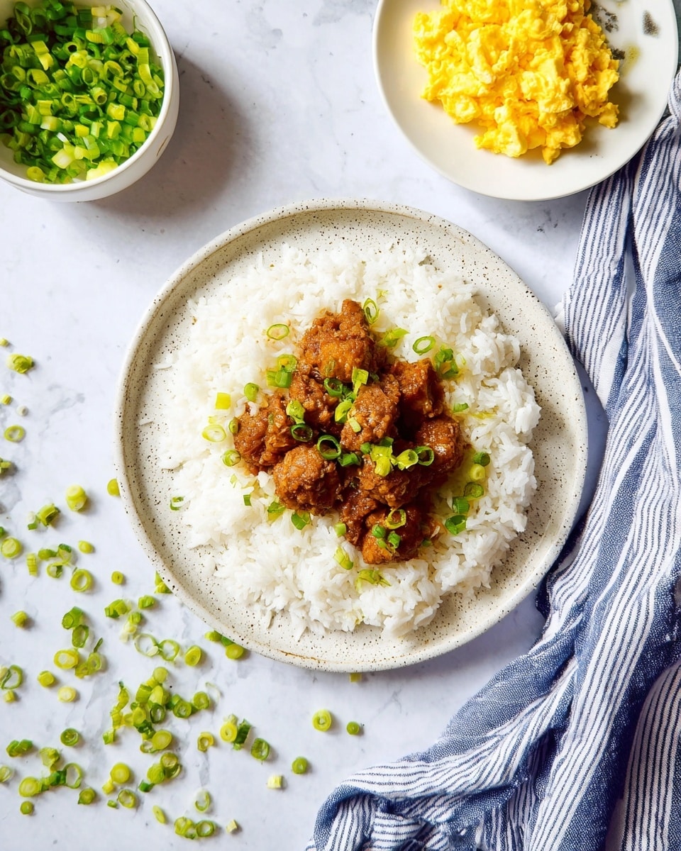 Before serving, sprinkle the sliced green part of the green onions on top for freshness and color. Serve with fluffy white or brown rice, or for a low-carb option, cauliflower rice works beautifully. Don’t forget a drizzle of sriracha if you like a spicy twist!
