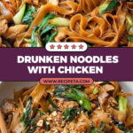 Delicious and vibrant Drunken Noodles, a popular Thai stir-fry featuring tender chicken, wide rice noodles, fresh vegetables, and fragrant Thai basil in a flavorful savory sauce. Ready in under 20 minutes, this dish offers a perfect balance of spicy, savory, and sweet notes, elevated by the optional drizzle of chili oil vinegar and crunchy crushed peanuts.