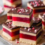 This Raspberry Caramel Millionaires Shortbread is a decadent, vegan, and gluten-free layered dessert featuring a crisp almond and flour base, a tangy raspberry jelly, a smooth salted caramel cashew layer, and a rich vegan chocolate topping. Perfect as a fancy treat or for special occasions, this no-bake indulgence combines fruity, salty, and sweet flavors with delightful textures.