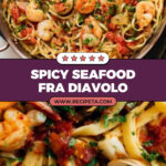 Seafood Fra Diavolo is a classic Italian-American dish featuring a spicy, robust tomato sauce simmered with clams, scallops, shrimp, and crab meat, served over bucatini pasta. The sauce gets its signature heat from crushed red pepper and pepperoncini peppers, creating a flavorful and vibrant seafood pasta perfect for a special occasion or comforting meal.