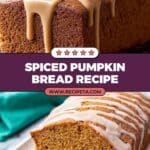 This Pumpkin Bread with Salted Brown Butter Glaze is a perfectly spiced quick bread that combines the warm flavors of cinnamon, nutmeg, and cloves with a rich, nutty brown butter icing. The bread is moist and tender, baked to golden perfection, and finished with a glossy, sweet glaze that drips down the sides, making it an irresistible fall treat or dessert.