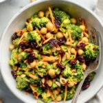 A vibrant and nutritious Vegan Curried Broccoli Chickpea Salad packed with fresh veggies, crunchy almonds, and a flavorful tahini-based curry dressing. Perfect as a light lunch or side dish, this salad combines the earthy flavors of turmeric and curry powder with the refreshing zest of lemon and the sweetness of dried cranberries.