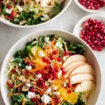 A vibrant and refreshing Winter Salad featuring a mix of kale, spring salad greens, shredded cabbage, carrots, crisp apples, candied nuts, goat cheese, and pomegranate arils, all tossed in a tangy red wine vinaigrette. Perfect for a light, nutritious meal or side dish during the colder months.